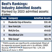 Massachusetts Mutual Life Group moved to fifth from fourth with a 4.8% increase to $381.2 billion, according to the report. TIAA Group dropped to fifth place after a 0.4% decrease to $363.8 billion. The report notes "TIAA's assets are significantly understated," as "most of its separate account assets are in its affiliate, CREF."