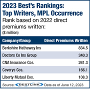 Berkshire Hathaway Insurance was the top MPLI underwriter based on occurrence, with $834.5 million of DPW and a market share of 31.6%, followed by Doctors Company Insurance Group with DPW of $340.3 million and a 12.9% market share, and CNA Insurance Cos. with DPW of $261.3 million and a market share of 9.9%.