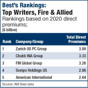 No. 1 Zurich Insurance US PC Group’s 2020 fire and allied premiums rose 13.9%. Among the top 10, No. 3 FM Global Group’s 2020 premiums rose at the greatest rate, up 31.7%. The only insurer among the top 10 whose premiums fell in 2020 was Assurant P&C Group, down 0.8%.