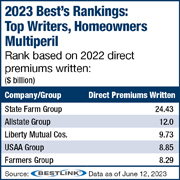 OLDWICK, N.J. //BestWire// - State Farm Group continues to dominate the U.S. homeowners multiperil insurance market with an 18.3% share, based on 2022 direct premiums written, according to a new Best’s Ranking. Direct premiums written for State Farm increased 10.8% to $24.43 billion.