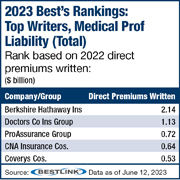 The AM Best Ranking report lists the top 100 U.S. writers of medical professional liability insurance in 2022 by direct premiums written; the percentage change in premiums; market share, 2020-2022; adjusted loss ratios, 2020-2022; and MPL premiums as a percentage of company premiums.