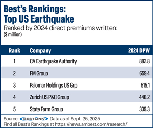 OLDWICK, N.J. //BestWire// - While U.S. earthquake direct premiums written increased 2.9% for the industry, premiums at No. 1 writer California Earthquake Authority declined 9.1% in 2024, according to a new Best's Rankings report.