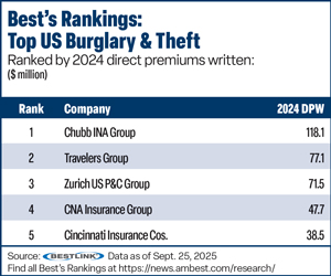 The report ranks U.S. burglary and theft carriers and lists: Direct premiums written; percentage change; market share for 2024, 2023 and 2022; adjusted loss ratios for those three years; and the percent of company premiums the line accounts for.