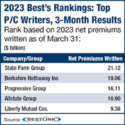 There was no change among the top five writers. State Farm Group topped the ranking with $21.12 billion in net premiums written for the quarter, an increase of 18.3%. No. 2 Berkshire Hathaway Insurance saw a 3% increase, to $19.06 billion.