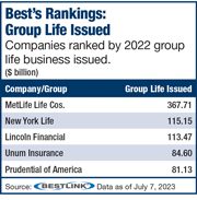 The AM Best ranking measures total U.S. group life insurance issued in 2022, as well as the change on a percentage basis.