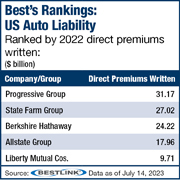 The report includes 2022 direct premiums written and the percentage change; percent market share and adjusted loss ratios for three years; and U.S. auto liability share of a company’s premium.
